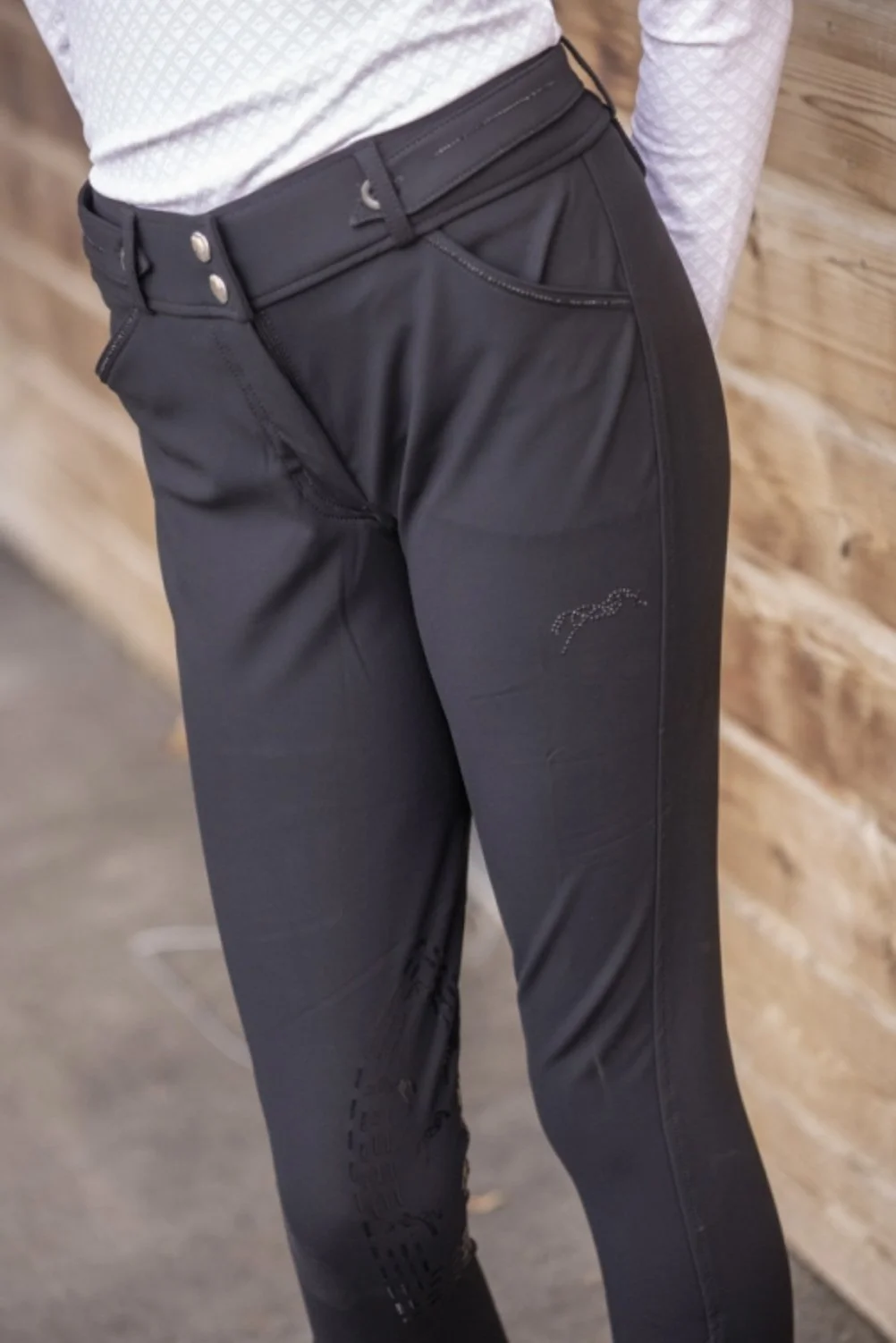 On the upper left leg, the Pénélope logo in rhinestones adds a girly touch to these riding leggings.