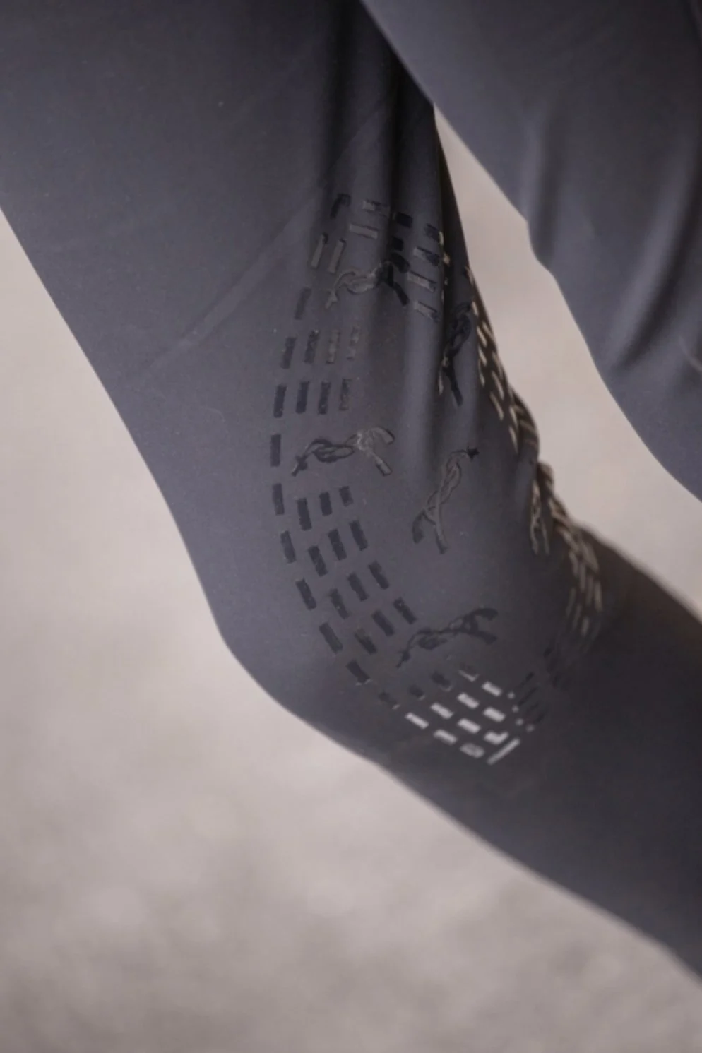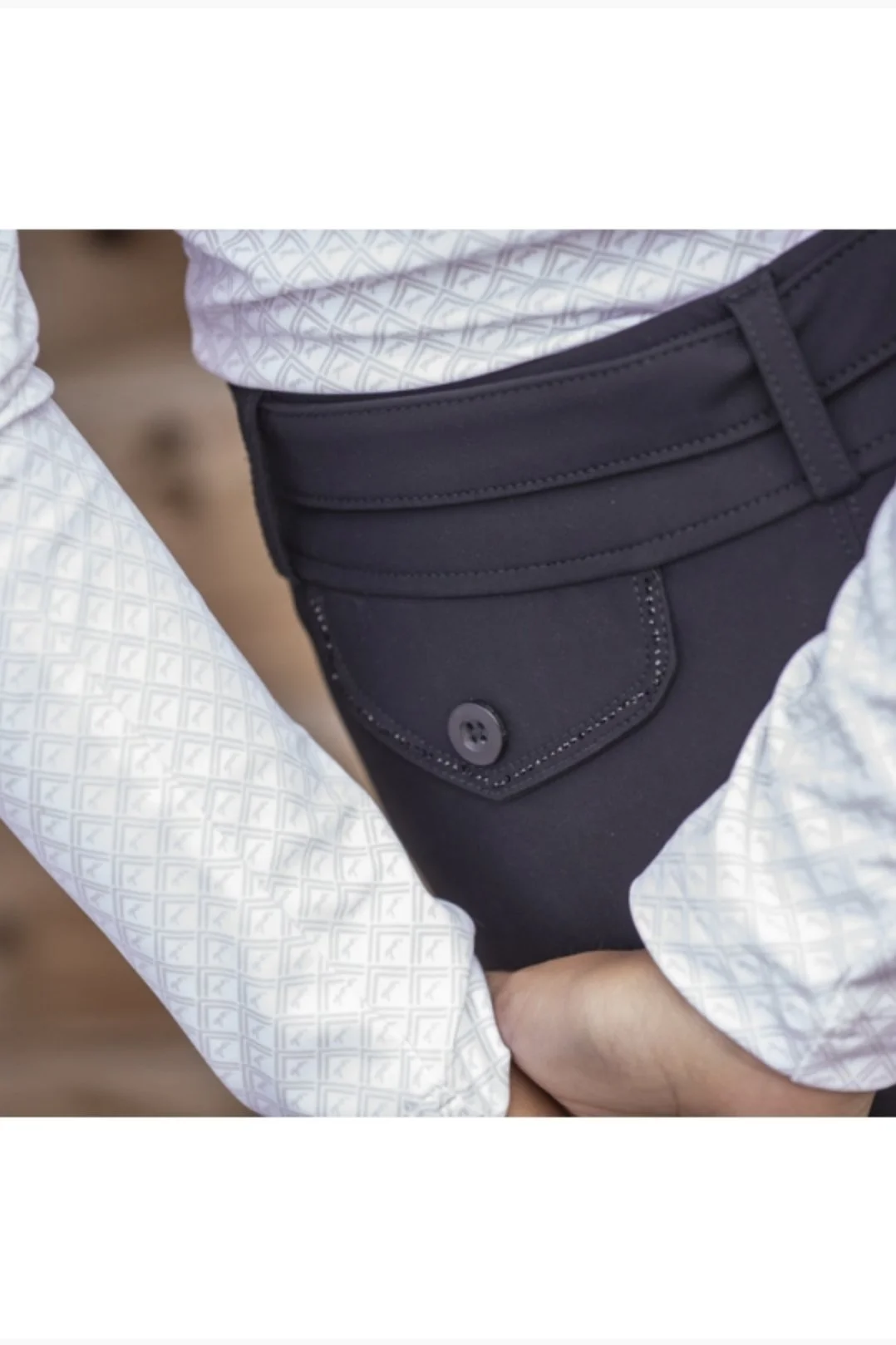 The Navy Élégance Breeches feature a row of rhinestones on the waistband and along the front and back pockets. A little Penelope horse, also in rhinestones, sits in the middle of the left thigh. These comfortable stretch breeches have non-slip reinforcements on the inside of the knees and a slightly high, close-fitting waist. The lower leg is made from Lycra to adapt to a wide range of body shapes. A very pretty piece that is comfortable to wear and sure to cause a sensation during horse shows.